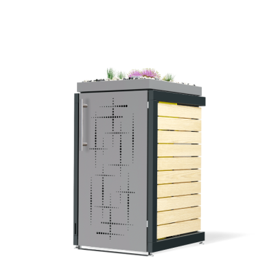 Neben dem integrierten Pflanzdach sind die Rück- und Seitenwände unserer Mülltonnenboxen, standardmäßig aus ungelochtem Edelstahl. Sie können aber auch bei der Mülltonnenbox mit Pflanzdach beispielsweise die Seiten- und Rückwände mit einem Stanzdesign oder Türdesign erhalten. Die Oberfläche ist bei den sichtbaren Teilen unserer Müllboxen einseitig geschliffen. Bei den Türen, den Seiten und der Rückwand ist der Schliff waagrecht angeordnet. Stöbern Sie in unserem Shop und konfigurieren Sie auch gerne Ihre Fahrradbox oder eine Box für den Mähroboter. Sie können hier bei örtlichen Bodenunebenheiten die Höhe angleichen durch die Ausgleichsfüße. Lassen Sie sich gerne von uns beraten und vertrauen Sie unserem Know-how.