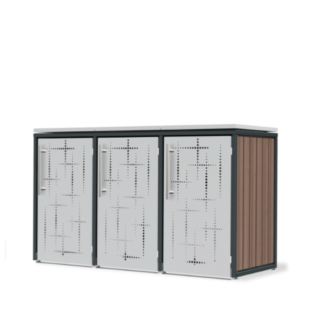 Unsere Mülltonnenbox Max zeichnet sich durch ein individuell-minimalistisches Design aus: Konfigurieren Sie anhand vielfältigen Farben, Materialen, Griffen, Dachvarianten und Verkleidungen Ihre individuelle Mülltonnenbox. Erhältlich ist die Mülltonnenverkleidung in der Ausführung Edelstahl (V2A Qualität mit satinierter Oberfläche), pulverbeschichtete Lackierung auf KTL beschichtetem Stahlblech und mit Thermowood Holz-Seitenverkleidungen. Unsere Müllbox passt sich ganz Ihren Bedürfnissen an und bietet optional Platz für 120 Liter oder 240 Liter Mülltonnen.