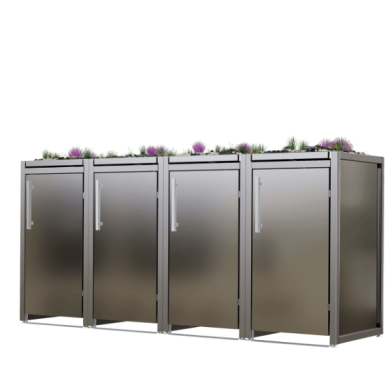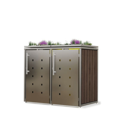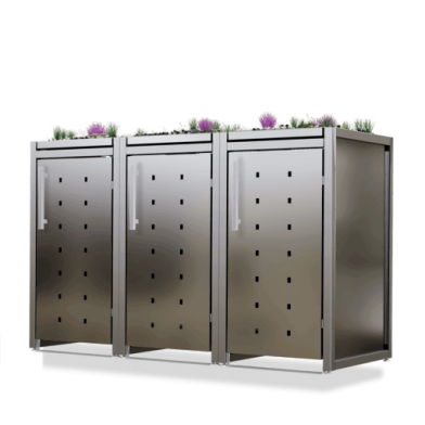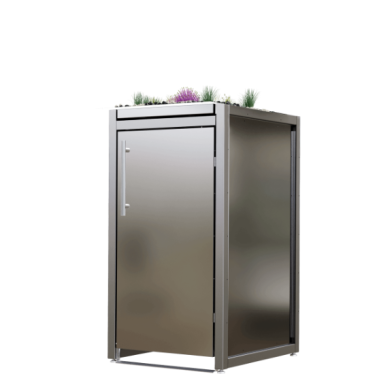 Bei einer Müllbox aus Edelstahl ist alles ohne Montageaufwand einfach und bequem. Es ist komplett montiert. Diese Tonnenbox ist unverwüstlich im Einsatz. Durch das hochwertige Edelstahl ist die Witterungsbeständigkeit einwandfrei. Die Bauweise ist massiv und die Türen und Bleche sind auf den Vierkantrohrramen aufgesetzt, was eine optimale Stabilität bewirkt. Die Kippvorrichtung ermöglicht Ihnen ein einfaches Befüllen der Mülltonne und ein grundsätzlich einfaches Handling. Entscheiden Sie sich außerdem bei masterbox24.de für einen Türanschlag DIN links oder DIN rechts. Die Bodenbefestigung und die abschließbaren Türen schützen Ihre Mülltonnenbox Edelstahl außerdem vor Fremdzugriff und Diebstahl. Das Pflanzdach hat selbstverständlich einen Wasserablauf. Sie begrünen somit Ihre Mülltonnenbox Edelstahl und setzen schöne Elemente in Ihren Garten, Ihren Vorgarten oder auf dem Hof. Zierkies verschönert außerdem das Pflanzdach. Die Wasserablaufröhrchen sind an der Rückseite integriert, damit das Wasser sich nicht stauen kann innerhalb der Box. Das Team berät Sie bei Fragen ausführlich. Setzen Sie ein optisches Highlight mit einer Bepflanzung Ihrer Mülltonnenbox Edelstahl. Die Sonnenstrahlen werden dadurch abgehalten und die Temperatur in der Mülltonne reguliert sich. Unangenehme Gerüche werden so minimiert. Ein abschließbarer Knebelgriff bietet Ihnen des weiteren Sicherheit bei Ihrer Müllbox. Sie haben so einen Schutz vor Vandalismus und verhindern, dass Unbefugte Ihre Mülltonne nutzen. Auch vor Diebstahl sind Ihre Tonnen so geschützt. Wenn Sie Tonnenboxen für mehrere Mülltonnen haben, sind die Schlösser immer für die jeweiligen Abteile identisch.